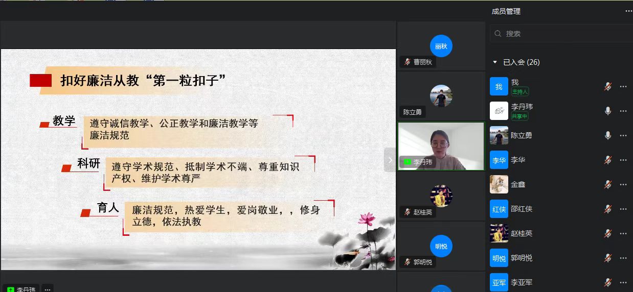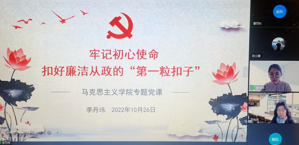 10月26日,下午3点,永利3044集团官网教师、纪委监督员李丹玮同志在钉钉视频会议中为全院教职工讲了一堂生动的党课。题目为:《牢记初心使命扣好廉洁从政的“第一粒扣子”》。视频会议由曹丽秋同志主持,公司全体教职工聆听了党课。