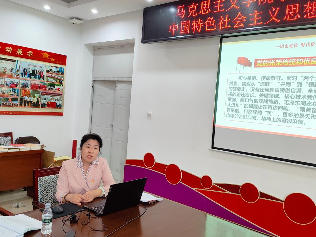 党总支书记赵桂英同志以《深刻理解 踏实践行“三个务必”》为题,从党的二十报告开篇习近平总书记提出的“三个务必”入手,围绕“三个务必”的历史定位和时代价值、理论依据和重大意义、使命担当和踏实践行等三个方面进行了讲授。赵桂英同志以生动详实的党史、新中国史、改革开放史和新时代十年的典型案例切入,从历史的纵向,深刻揭示出我们党百年成就与成功的密码就是十九届六中全会总结的“十个坚持”,而“三个务必”恰是其中的“三个坚持”--人民至上、艰苦奋斗、敢于斗争,这些认识对于公司《概论》课和《纲要》课的党员教师是一次理论提升与信念教育、品格融入课程的示范。在谈到理论依据时,赵桂英同志阐释了“三个务必”的“永恒课题和终身课题”、“光荣传统和优良作风”和“鲜明品格和精神特质”。学用结合,就此分析马院的优劣势、长短板,以“牢记教育初心、担当育人使命”、“谦虚谨慎为人、艰苦奋斗创新”、“增勇气强本领、敢于善于斗争”三个方面建议,强化思政课教师落实习近平总书记提出的“四有”好老师、“六要”思政课教师、“三为(人、事、学)”大先生、思想、政治、实践、专业“四练(炼)”要求和“八个相统一”的课程标准。