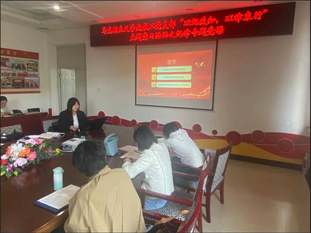 教工党支部副书记张清从开展党纪学习教育的重要性、党的纪律教育的历史沿革及推动党纪学习教育内化于心、外化于行等三个方面进行了讲解。她说“学纪”是基础、“知纪”是前提、“明纪”是根本、“守纪”是关键。最后强调指出:纪律的生命力在于执行,千万不能停留于挂在墙上、写在纸上、喊在嘴上。要抓牢纪律这把戒尺,坚持纪严于法、执纪执法贯通,精准运用监督执纪“四种形态”,做到有纪必执、执纪必严、违纪必究。