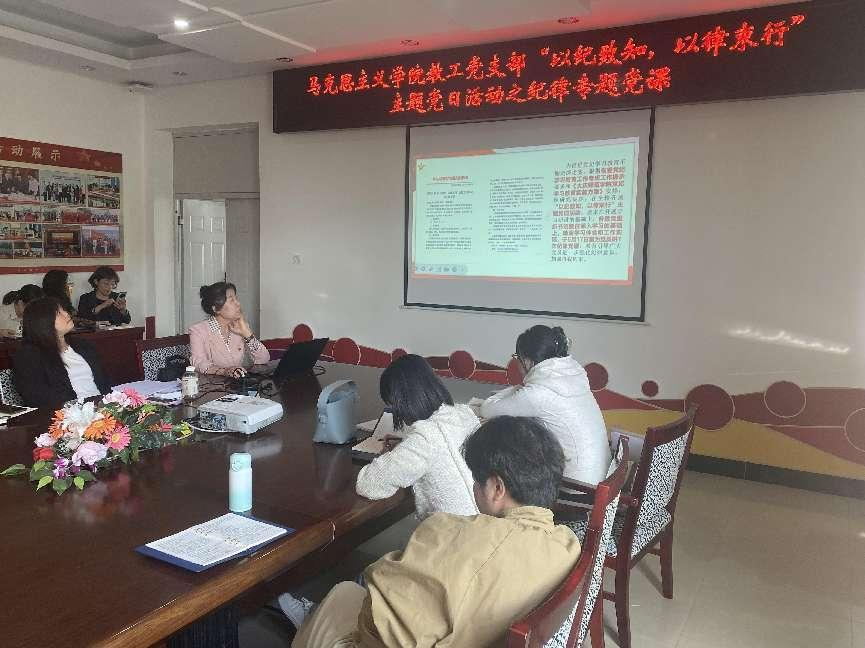 为推进党纪学习教育走深走实,根据省委党纪学习教育工作专班工作提示要求和《大庆师范公司党纪学习教育实施方案》安排,5月16日下午,马克思主义公司党总支书记赵桂英、教工党支部副书记张清,分别以《学纪·知纪·明纪·守纪--学习贯彻<中国共产党纪律处分条例>》《党的纪律建设永远在路上--推动党纪学习教育走深走实》为题,为永利3044集团官网全体党员讲授了“以纪致知·以律束行”主题党日活动之纪律专题党课。