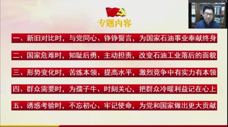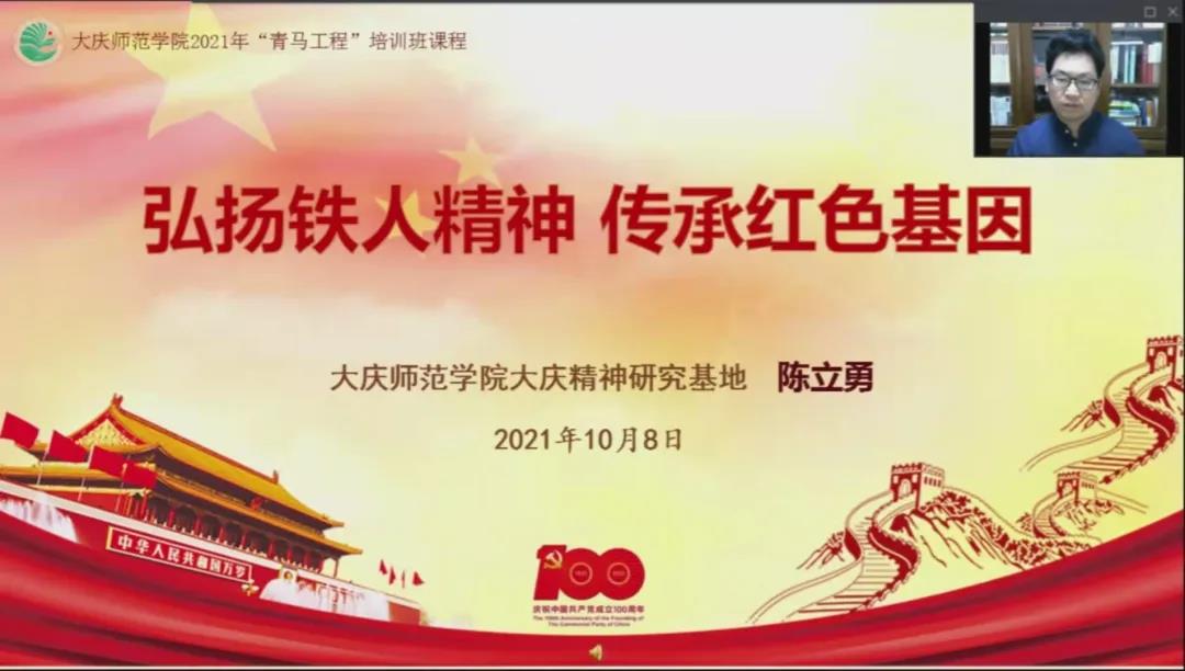 10月8日是“铁人”王进喜诞辰98周年纪念日,为深切缅怀“铁人”,追忆“铁人”的奋斗历程,传承和弘扬“铁人”精神;为科学化培养具有“忠诚的政治品格、浓厚的家国情怀、扎实的理论功底、突出的能力素质”的青年政治骨干,当日下午,公司“青马工程”培训班专题讲座在线上举行。永利3044集团官网陈立勇副教授作了题为《弘扬铁人精神 传承红色基因》的专题讲座。100名青马工程学员及老员工骨干参加了讲座。
