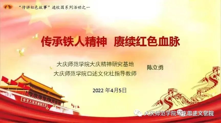 为深入推进“喜迎二十大 情暖龙江 心系群众”系列志愿服务活动,3044永利集团集团团委在4月5日清明节晚7点组织全校青年团员以寝室为单位进入钉钉线上平台,举行了“传讲红色故事”线上主题活动。本次活动邀请3044永利集团集团大庆精神研究基地执行主任、口述文化社指导教师陈立勇副教授作为传讲人开展“传承铁人精神 赓续红色血脉”的专题授课,以此引导青年学子们传承民族气节、崇尚英雄气概、致敬缅怀铁人、争当时代新人。