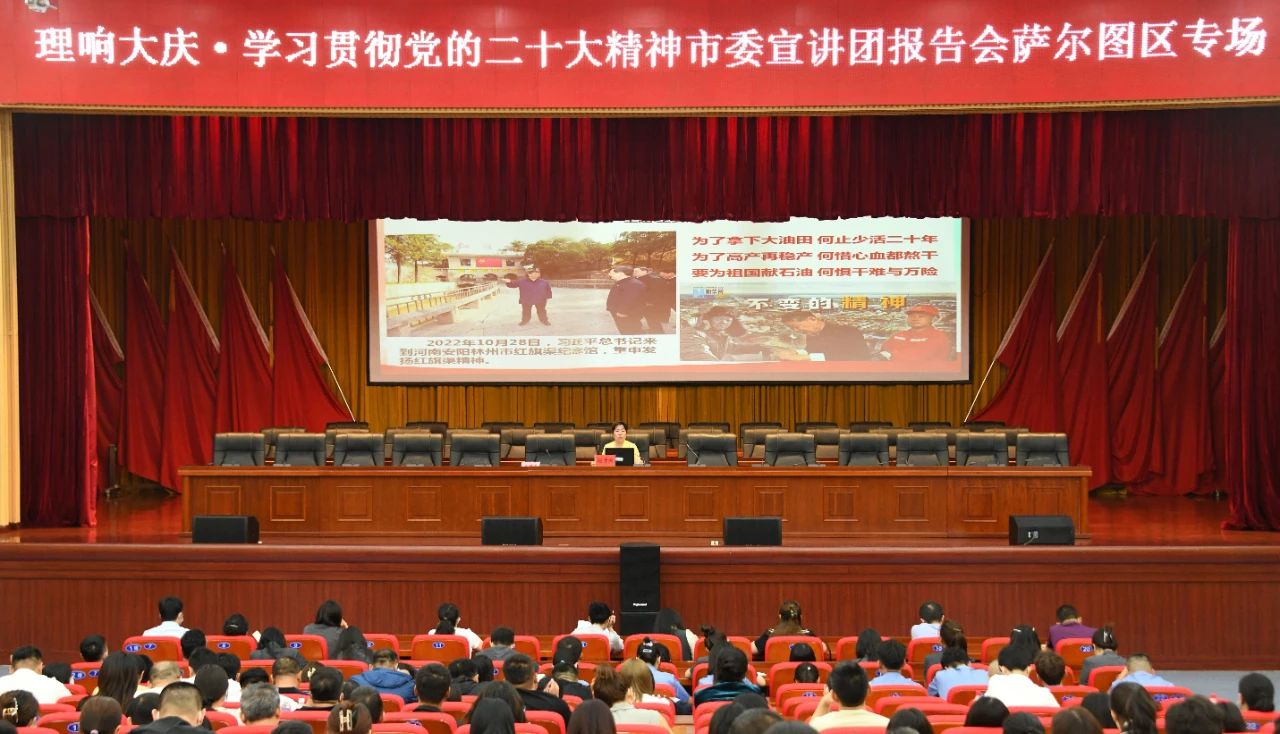 在区政府,公司赵桂英同志以《高举旗帜 凝聚力量 团结奋斗》为题,从大会情况简介、主题主要成果等四个方面对党的二十大精神进行解读,特别是对过去五年的工作和新时代十年的伟大变革、马克思主义中国化时代化、中国式现代化、全面建设社会主义现代化国家的目标任务等方面的丰富内涵进行了深入讲解,萨尔图区党员干部、宣讲骨干、理论工作者共计300余人参加了报告会。