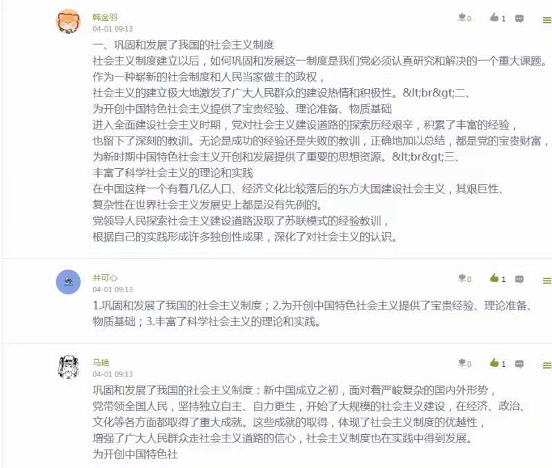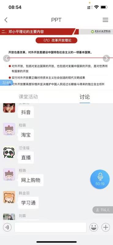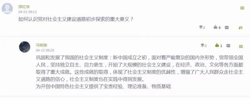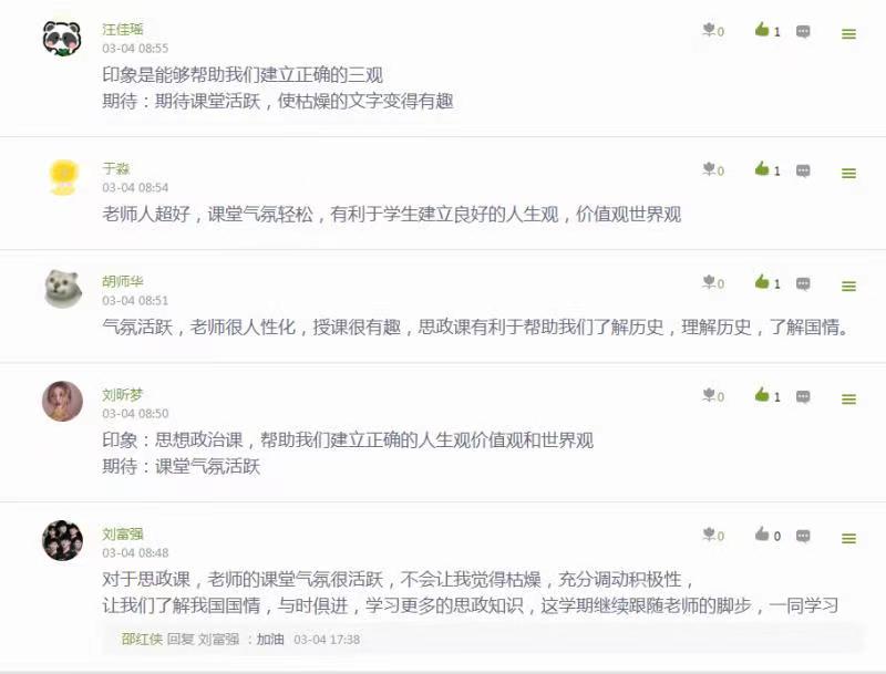 教学过程中员工能够积极思考也是课堂活跃的一个标志,如何能引导员工积极思考,这在很大程度上取决于教师上课过程中互动问题的设计与交流。 邵红侠老师为了提高线上课堂互动性和针对性,对线上教学准备更充分,教学内容更丰富,很好地将教材体系转化为线上教学体系,重点突出在知识点的深度剖析以及相关案例的选取挖掘上下功夫,选取时政热点和员工感兴趣的知识点增加教师与员工之间的有效而深入的教学互动。例如在对社会主义制度确立这个问题的讲解中,以问题为导向、层层递进、步步深入,再提出更多的问题:中国为什么选择了社会主义道路而放弃了资本主义道路?选择这条道路的历史必然性和理论依据体现在哪里?中国共产党是如何探索中国道路的?通过互动讲解,让问题带着员工走,老师由理论讲授者变成知识引导者。随着员工对问题的深入思考,老师有意识地对员工进行思维能力训练,对于课堂讨论的话题以及同学们的发言尽量一一回复,做到有问必答、有求必应,让同学们感受到教学形式虽然变了,老师却不会缺席,老师就在身边。从课后统计来看,同学们表现都非常优秀,他们热情、积极、活泼,都积极主动参与互动活动,也给老师很大的鼓舞与激励。
