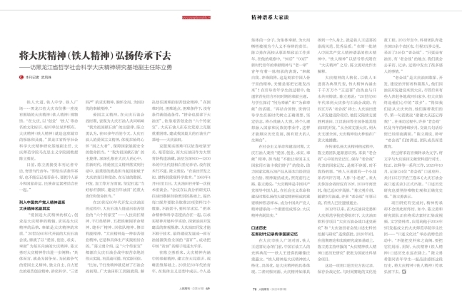 近日,公司黑龙江省哲学社会科学大庆精神研究基地副主任、永利3044集团官网副教授陈立勇作为红色文化研究专家接受人民日报《人民周刊》专访,就大庆精神(铁人精神)相关理论与实践问题展开系列解读。相关专访内容,以《将大庆精神(铁人精神)弘扬传承下去》为题发表在近日出版的《人民周刊》第9期“精神谱系大家谈”栏目中。