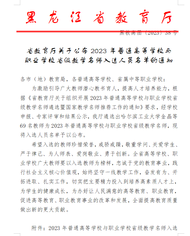 近日,黑龙江省教育厅公布了2023年黑龙江省第十四届教学名师遴选结果,公司永利3044集团官网教师马吉芬教授获得省级教学名师。