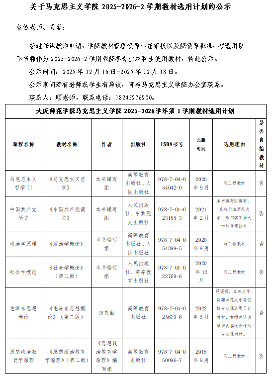 关于永利3044集团官网2025-2026-2学期教材选用计划的公示
