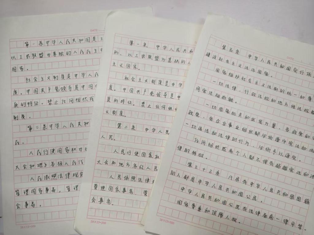 12月3日,公司率先启动“笔墨传宪韵,笃行铸信仰”宪法抄写活动。宪法所规定的公民基本权利与义务、国家机构职权等核心内容,是保障人民当家作主、维护社会稳定的关键依据。同学们自主选取这些核心条款进行手写誊抄,部分同学完整抄写宪法总纲,在笔墨流转中体会宪法文本的严谨与神圣。后续的感悟分享会上,大家结合专业所学,畅谈对马克思主义法治思想与宪法实践内在联系的理解,优秀抄写作品还在班级宣传栏集中展示,让宪法精神在班级内广泛传递。